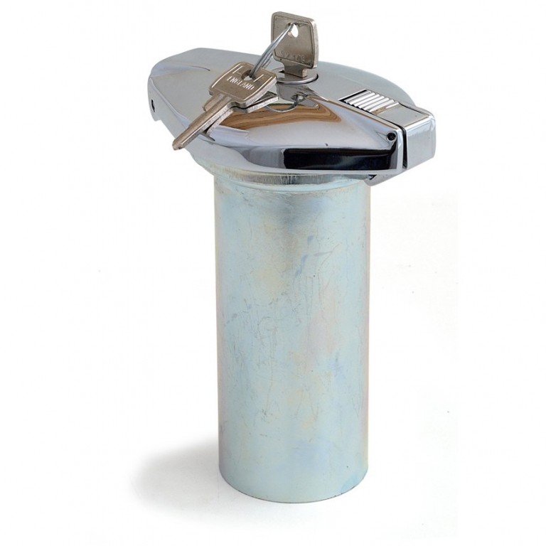 Lozenge shape fuel filler cap, chrome finish, complete with 2 in (50mm) diameter mild steel filler neck. Lockable type with two keys supplied. As used on Morgans but can be used on other cars. A version with a 2 1/4 in (57mm) diameter filler neck is also available, refer to 015.243