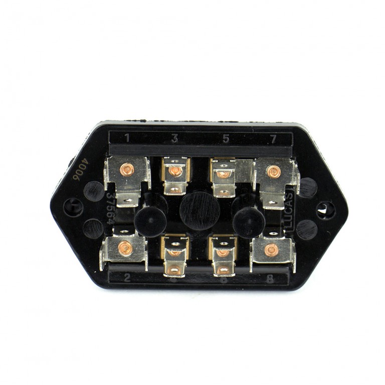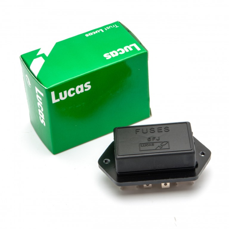 Original Lucas 6FJ fuse box holds 4 fuses complete with cover, connections on the rear of the box. Lucas 37564