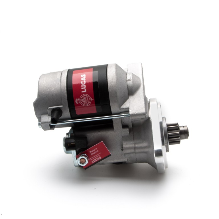 Lucas up-rated, lightweight starter motor, fits Jaguar XK120, 140, and 150 models. Strong, powerful, offset gear-reduced starter motor, delivering huge cranking torque through a set of steel internal gears.