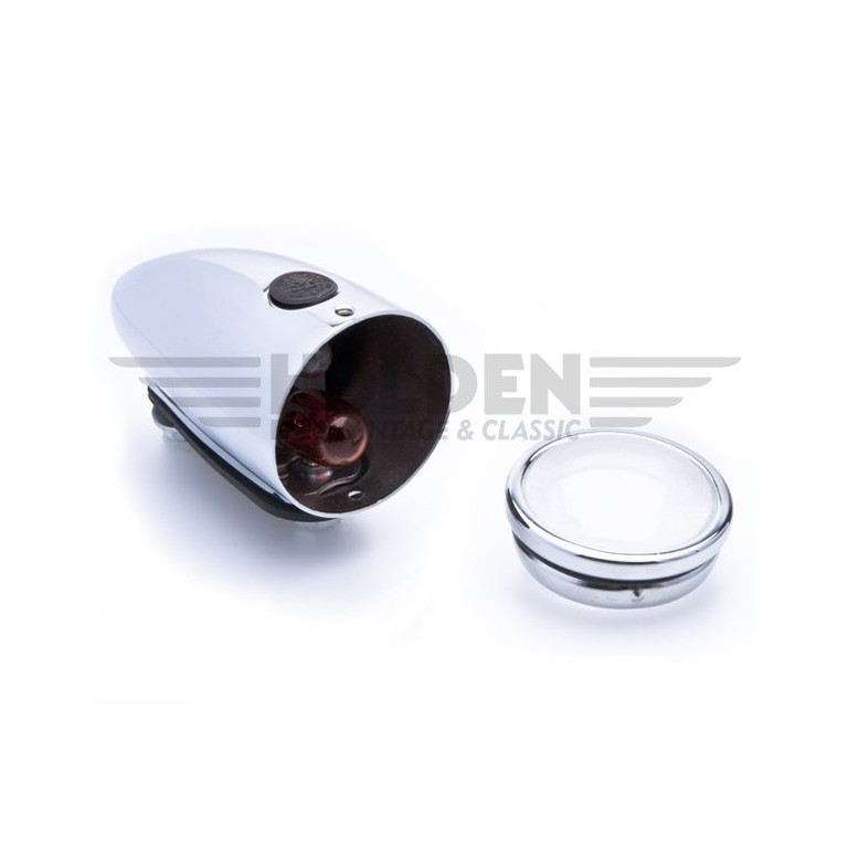 The Lucas 1130 sidelamp is produced in many different variants, each have subtle differences, whether it be the lens type, the bulb holder, addition of a Lucas emblem to the top, or even the way in which the body is manufactured. This particular version has two separate capless type bulbs installed, providing sidelight and amber indicator functions. The lens is frosted glass within a chrome mounitng ring, and the lamp body features a Red Lucas Medallion on the top, which acts as a tell tale. Supplied complete with bulbs, base gasket and fixing bolts.