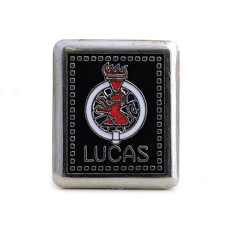 For Lucas P100's. Nickel plated with four colour enamel. 19.3mm wide and 22.5mm tall. Brass version is 010.357 and chrome version is 010.359