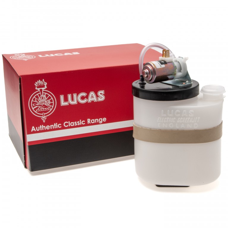 Plastic container washer bottle, marked 'Lucas Electric Screenjet' to the side. Supplied with mounting bracket and strap. 12 volt electric pump fitted to the lid. As fitted to Morgans and many other cars in the 1960's and 1970's Copy of the Lucas 10SJ, WSB101.