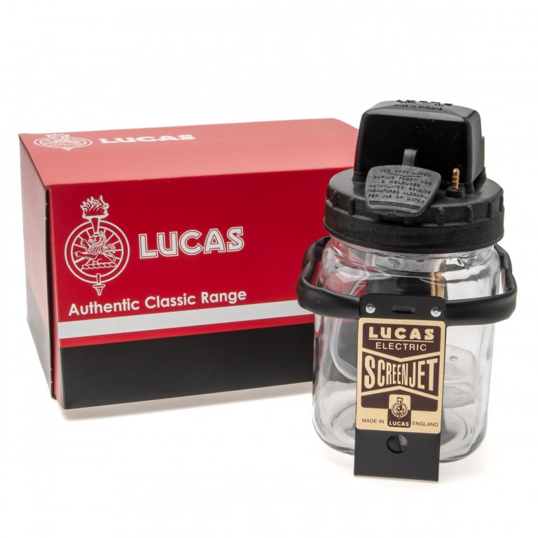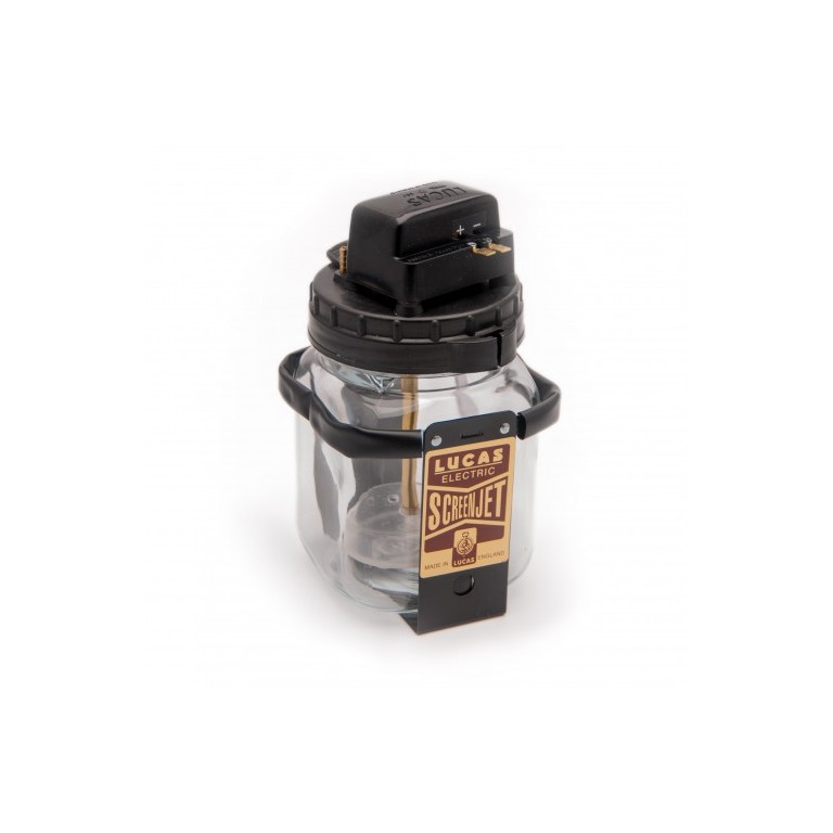 Lucas 2SJ Screenjet electric washer bottle, This product is fully licensed and carries 'Lucas' branding both on the pump cover and the 'Screenjet' label.