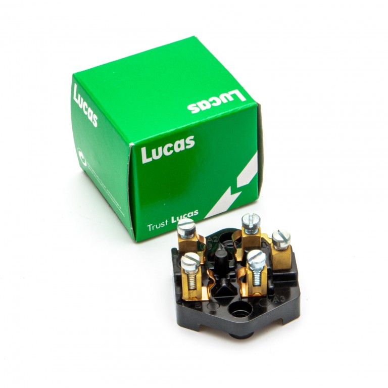 Lucas SF6 Fuse Box for two glass type fuses, 37132. Provision to store two more, retained by clips. Plated screw connections. No cover, but ideal for adding fuses into an existing set up. 1G2613
