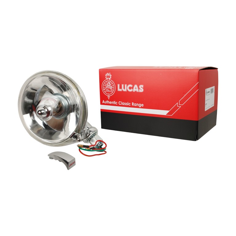 Original Lucas 5 3/4" Lucas Spotlamp SLR576 you always saw on cars during the classic period. It has 5 rivets holding the mounting bolt housing. Base mounted via a single hollow bolt, through which the wires pass and supplied with a bulb. This lamp is available as a rear-mounted version, as seen on the rear of many Works competition cars of the '60s, and also available is the complementing fog lamp version.