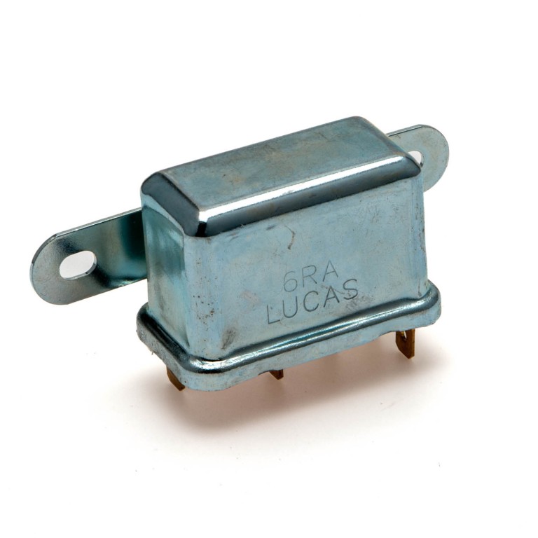 Lucas 6RA type SRB111 Relay. Originals are commonly marked 6RA. A Relay is an electrical switch which uses low wattage current to open another switch. It is this second switch that carries and switches the high wattage current.