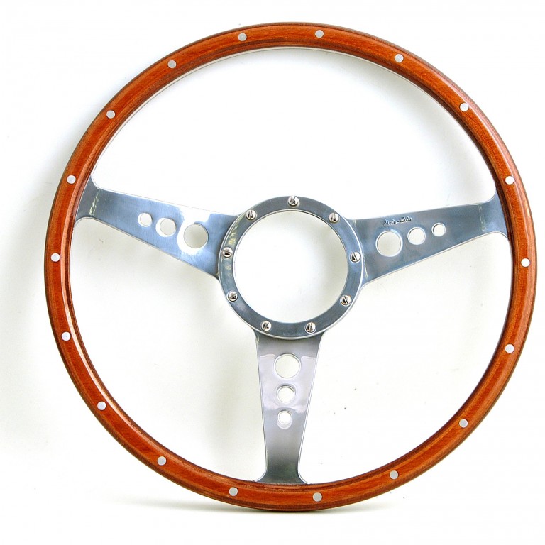 The original classic British wood rim Steering Wheel by Moto-Lita. Hand-built from selected cross-laminated wood which is bonded and riveted to a one-piece, heavy-gauge, hand-polished, aluminium alloy frame. The underside of the rim has 36 hand-carved finger notches.