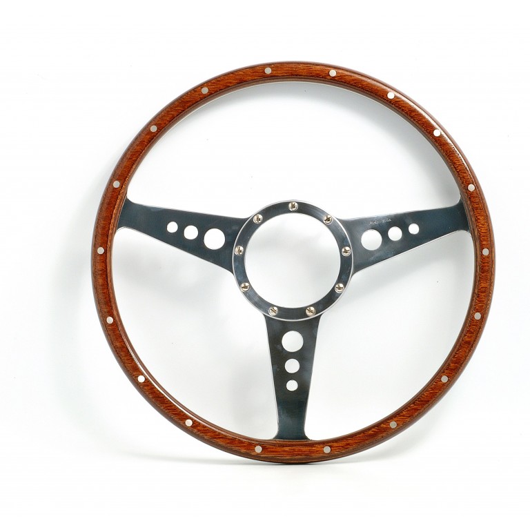 The original classic British wood rim Steering Wheel by Moto-Lita. Hand built from selected cross-laminated wood which is bonded and riveted to a one piece, heavy gauge, hand polished, aluminium alloy frame. The underside of the rim has 36 hand carved finger notches. The rim is finished in a hard wearing deep lustre resistant to petrol, oil and the elements. This one is flat, but a dished version is also available, as are sizes from 13 to 16 inch diameter. A range of bosses to suit different applications is available to purchase separately