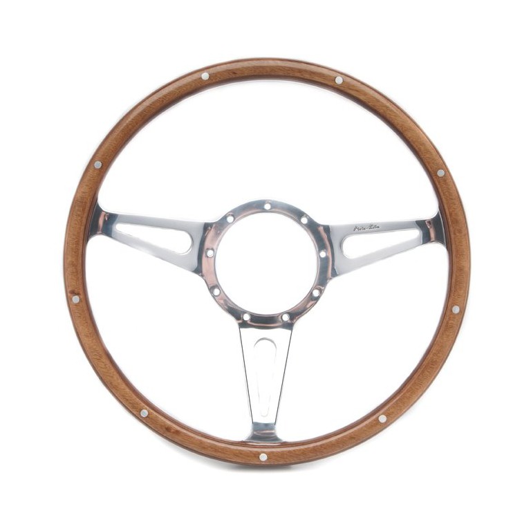 The original classic British wood rim Steering Wheel by Moto-Lita. Hand built from selected cross-laminated wood which is bonded and riveted to a one piece, heavy gauge, hand polished, aluminium alloy frame. The underside of the rim has 36 hand carved finger notches. The rim is finished in a hard wearing deep lustre resistant to petrol, oil and the elements. This one is dished, but a flat version is also available, This pattern of wheel is only stocked in 14 and 15 inch diameter. A range of bosses to suit different applications is available to purchase separately.