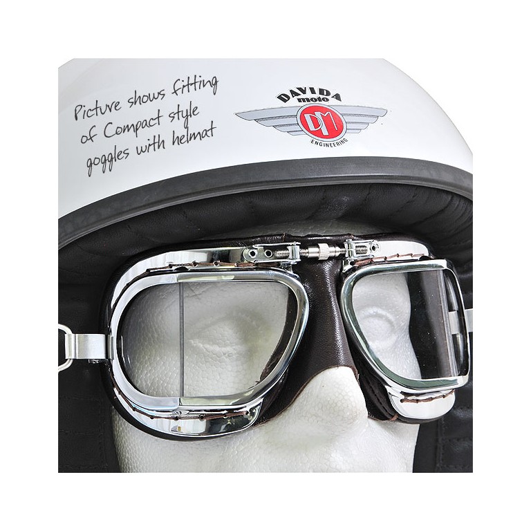Over time crash helmets have become more padded and many now have limited space to comfortably wear a pair of goggles. The black painted frames of this Compact version of the Mark 9 styled goggles are reduced in height by 5mm and have louvres to prevent misting and knurled screw nose bridge adjustment. The thin padding, covered with hand stitched black PVC, has been shaped to fit under the more modern helmets. Quality elasticated coloured headband with snap-on clips. Moulded and coated polycarbonate replaceable lenses tested to BS EN138. Supplied with an Instruction Leaflet