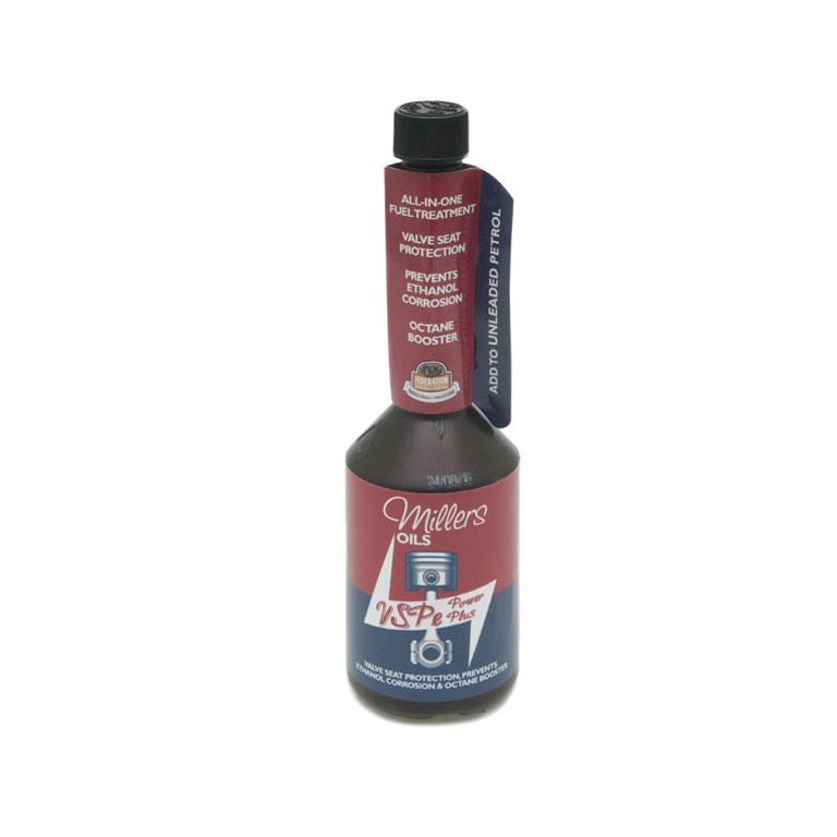 VSPe Power Plus is recommended for classic engines previously requiring leaded fuel but now running on unleaded fuel, where an octane improver is needed. Most petrol now contains ethanol which attacks rubber hoses. seals and metals such as brass and zinc. Ethanol also absorbs water which can cause corrosion and poor starting. VSPe Power Plus combats the adverse effects of ethanol and helps protect components from corrosion. It prevents valve seat recession when used with non hardened valve seats and improves the octane rating of the petrol. 250ml treats 40 litres of unleaded. This product is endorsed by the Federation of British Historic Vehicle Clubs as a fuel additive for protection against corrosion in metals