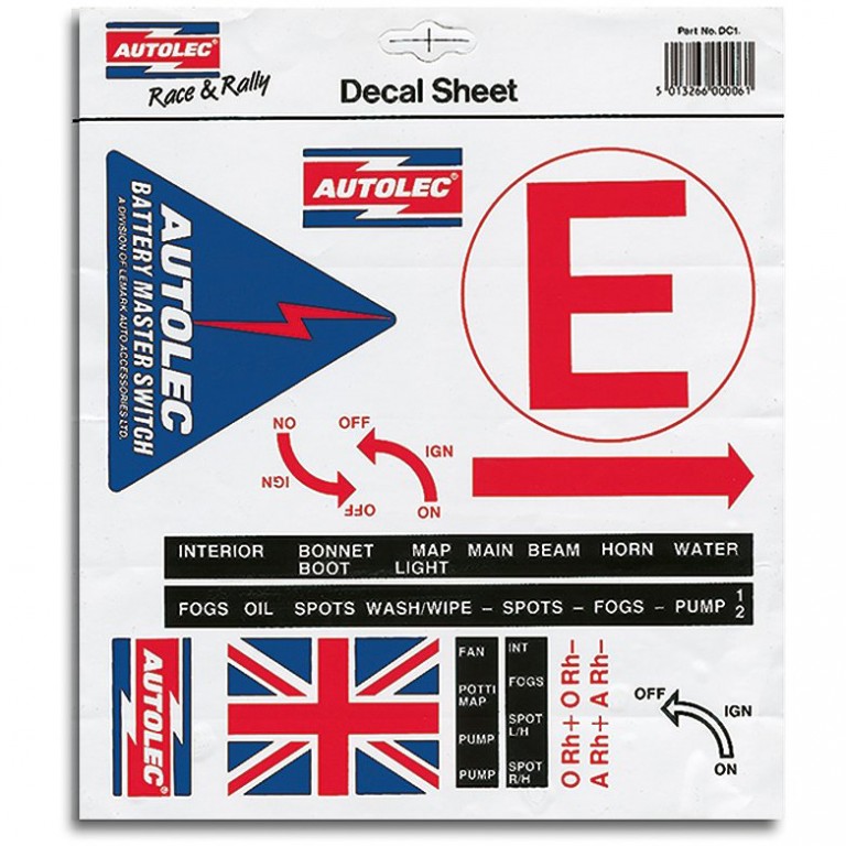 Includes Stickers for electrical cut-off, fire extinguisher, switch direction arrows, switch identification stickers, blood type (!) and union jack.