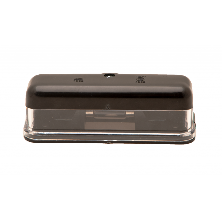 Number Plate Lamp Black Plastic L467 Copy. Dimensions: Length 110mm, Width 50mm, Height 38mm.