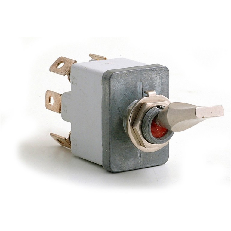 An On-off-on toggle switch, useful for operating indicator lamps etc. six terminals allow for switching 2 circuits independently. The very best in Toggle Switches - approved to CECC 96201-004. Used by many of the top international motor sport teams. Alloy topped switch housing with bright nickel lever, environmentally sealed to IP67 and IP69K to protect from ingress of moisture etc. Rated at 35 amps on 12 volt systems. A full range of switch functions is available. Requires hole size 12mm, or can be fitted to a 14.5mm diameter hole by using Threaded Washer and Bezel or Nut . This enables you to replace original Lucas switches on your car with this professional model.