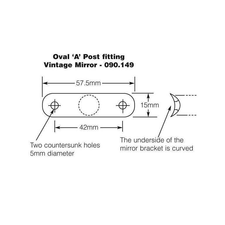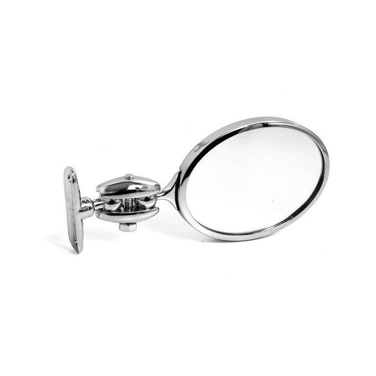 Oval type Desmo convex glass mirror suitable 'A' post or windscreen pillar fitting. Ideal for vehicles of the 1920's and '30's, 110mm x 82mm (overall length 175mm). complete with mounting bracket 58mm x 14mm, hole centres 43mm approx. A fitting kit is available as is a flat glass version.