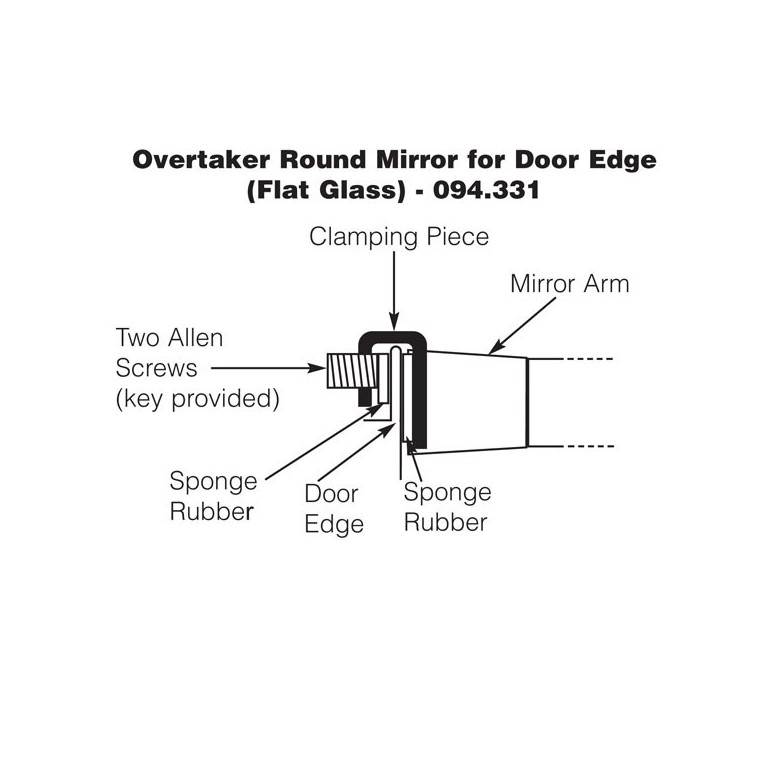 Overtaker outside round mirror for clamping to door frame edge. Chrome mirror head 100mm diameter, flat glass. The mounting bracket can be adjusted in relation to the arm simply by undoing the single central screw fixing and rotating the arm to the desired position, thus making the mirror completely universal. A smaller diameter version is also available 094.332