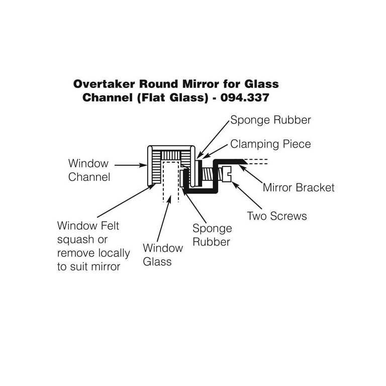 Round mirror which clamps on to the glass channel to give you a view of vehicles overtaking. Flat glass. A convex glass version is available if required