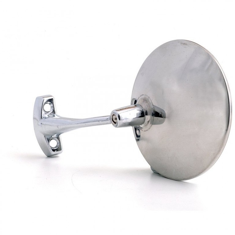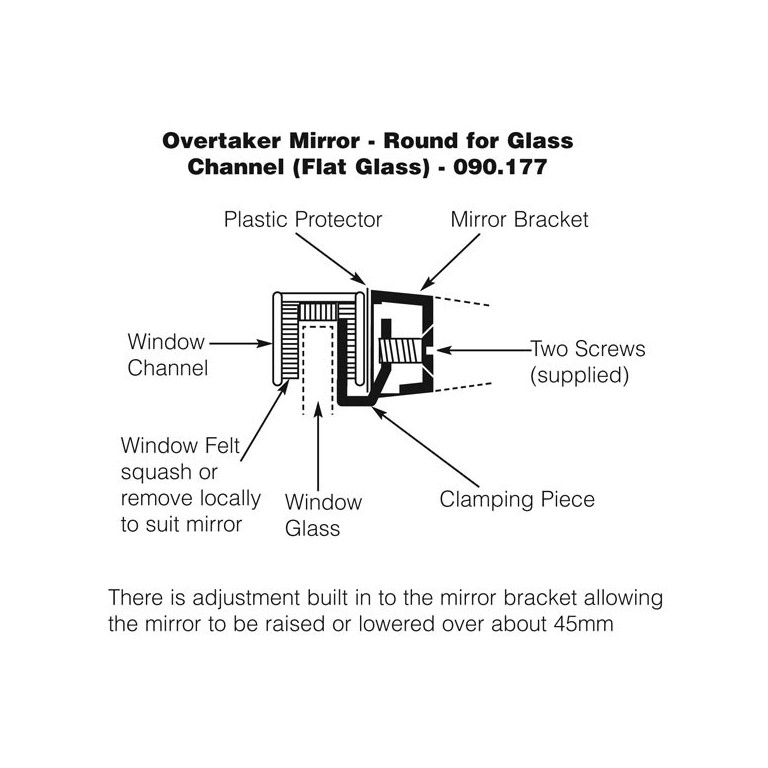 Round mirror that clamps to the glass channel to give you a view of vehicles overtaking. Flat glass 105mm diameter. This mirror can be fitted to the quarter light frame or glass channel without drilling. Arm length approximately 70mm. Oval and rectangular versions are also available