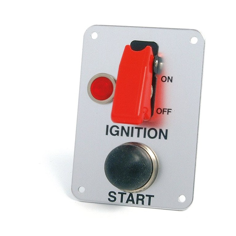 Aluminium Panel 67 mm wide x 96 mm tall with Toggle Switch for Ignition, Red Ignition Warning Light and Push Button for Start. The Toggle Switch has a flip-up cover which has to be lifted before the Toggle Switch can be switched on. Lowering this cover switches the Switch off. The Push Button has a waterproof cover. The Panel is marked IGNITION, ON, OFF & START and is supplied with 4 screws, wire and wiring diagram. Both switches rated at 30 amps on 12 volt systems. Ideal for a competition car, or piece of plant equipment such as a generator etc.