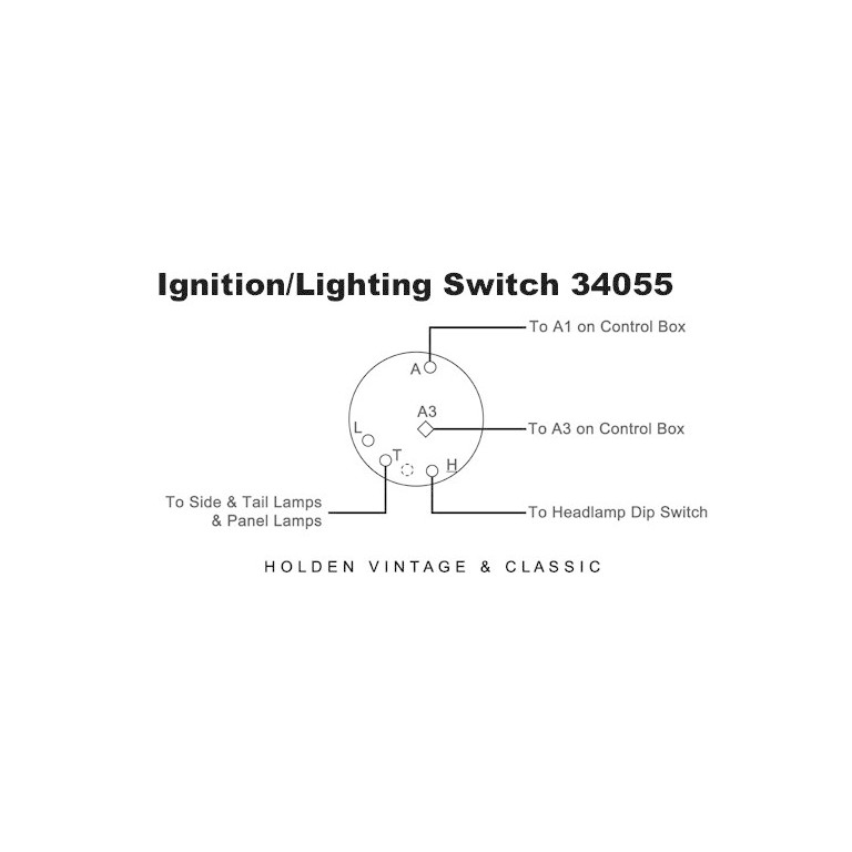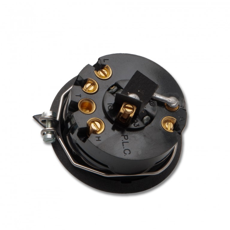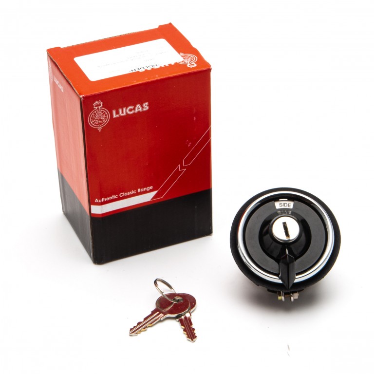 Lucas PLC6 Ignition and Lighting Switch, 34055, which can be fitted to almost any car or motorcycle. This is the later type switch where the words OFF-SIDE-HEAD appear in window. Requires 53mm diameter hole and secures in place with the clip included. Screw type connections for the wires. Supplied with two keys.