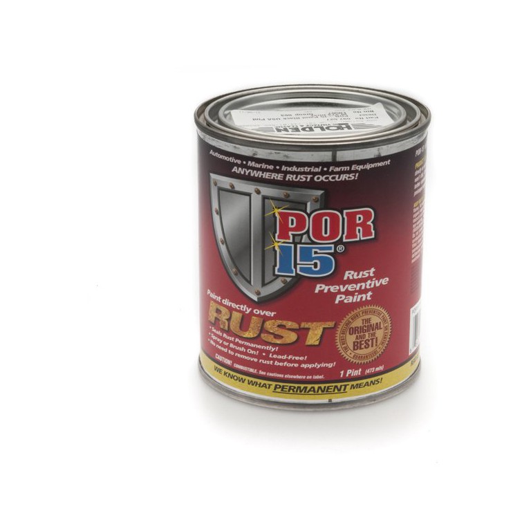 POR-15 Rust Preventive Paint is a high-tech, high performance rust-preventive coating designed for application directly on rusted or seasoned metal surfaces. It dries to an incredible rock-hard, non-porous finish that won't chip, crack, or peel, and it prevents rust from recurring by protecting metal from further exposure to moisture. Use it to coat rusty frames, floor pans, farm equipment, marine equipment, heavily corroded battery trays and can be used also to paint concrete floors. POR-15 Rust Preventive Paint is sensitive to UV light (sun) and must be topcoated for prolonged exposure to sunlight. Topcoating is not required for areas not exposed to sunlight. This paint has a gloss finish