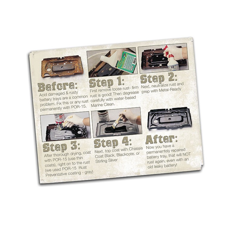 POR-15 Rust Preventive Paint is a high-tech, high performance rust-preventive coating designed for application directly on rusted or seasoned metal surfaces. It dries to an incredible rock-hard, non-porous finish that won't chip, crack, or peel, and it prevents rust from recurring by protecting metal from further exposure to moisture. Use it to coat rusty frames, floor pans, farm equipment, marine equipment, heavily corroded battery trays and can be used also to paint concrete floors. POR-15 Rust Preventive Paint is sensitive to UV light (sun) and must be topcoated for prolonged exposure to sunlight. Topcoating is not required for areas not exposed to sunlight.