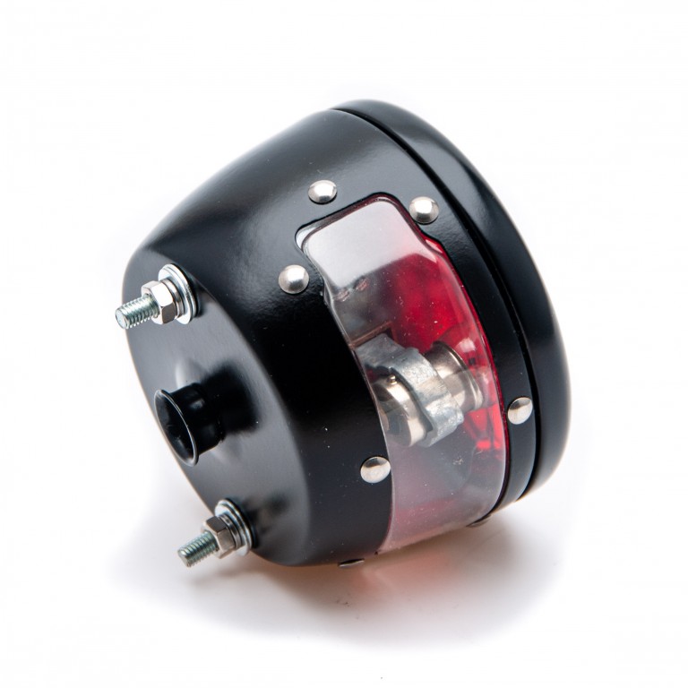 Lucas style ST38. Originally this lamp was fitted to many cars in the vintage and post vintage period. This is a quality reproduction and provides a rear lamp, brake lamp and numberplate lamp. Diameter 90 mm x 63 mm deep. 70mm diameter at the rear, 90mm diameter at the front, 65mm deep. The lamp is mounted by to fixing bolts at the rear with approximately 60mm centres. A modified version is available with a flasher incorporated.