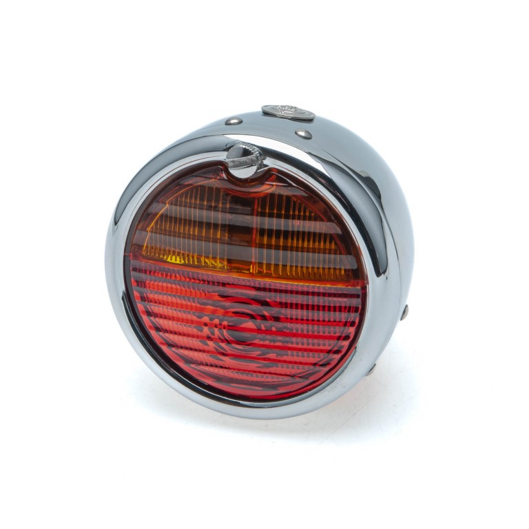 This is a quality reproduction providing a rear lamp, brake lamp and numberplate lamp, with internal modification to accomodate an extra bulb to provide a flasher facility and a dual colour red and amber lens.