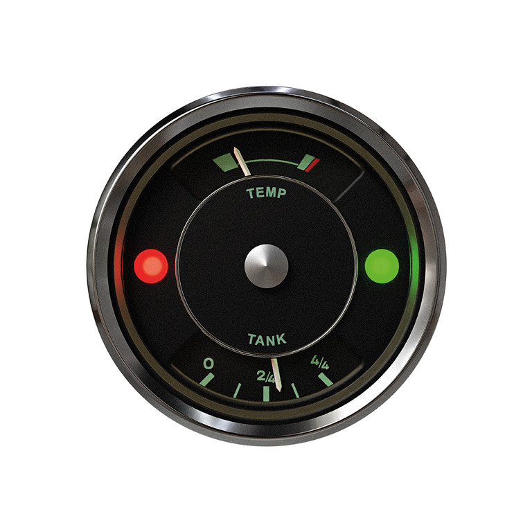 100mm dual temperature and fuel level gauge with oil and battery warning lights. Black dial with green print and white pointers. Full V chrome bezel. Floodlit illumination.