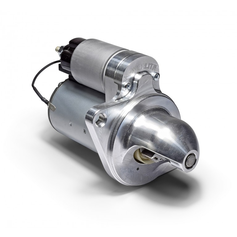a MicroStart to replace the original 5 inertia type. Perfect for motorsport applications, the new MicroStart will fit a whole range of vehicles including the MG Midget, MGA, MGB (early inertia type only) MGTD, MGTF, Bristol straight 6, Sunbeam Alpine, and Triumph Herald to name but a few. Weighing just 2.4 kilos, this tiny unit kicks out 1.3 kW of high torque power via an epicyclic gearbox. The nose cone is machined out of sturdy, solid aluminum and features an embossed Powerlite logo. The entire unit is not much longer than a ballpoint pen – perfect for tight, compact race engines. (Please note this unit is only suitable for Negative earth applications) .