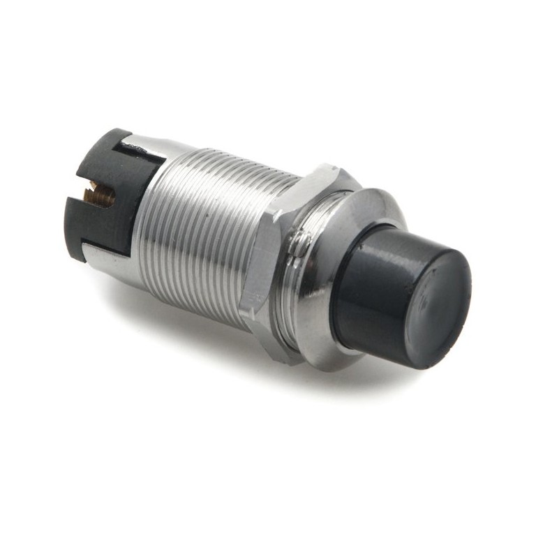 Quality reproduction of Lucas push button switch 31363. Push on - spring off. Requires 19mm diameter hole. Has long thread for wooden dashboards (maximum thickness 20mm). Chrome bezel 22mm diameter. For a similar switch with shorter thread for metal dashboards refer to SPB105