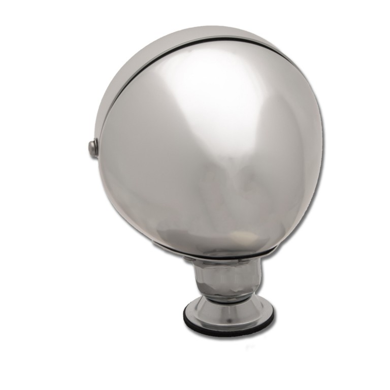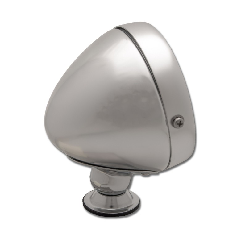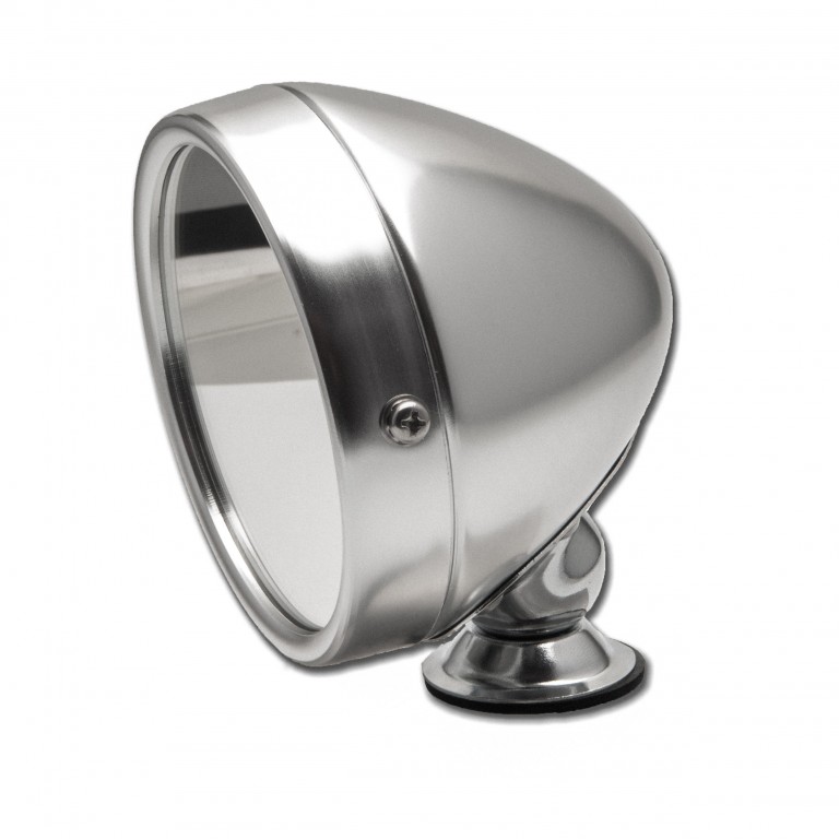 Raydyot copy racing type with single bolt fixing. Lightweight aluminium with polished finish. The head is 100mm diameter, the flat glass is 85mm diameter and it sits on a 40mm diameter base. For spare glass see 090.826 (flat) or 090.827 (convex)