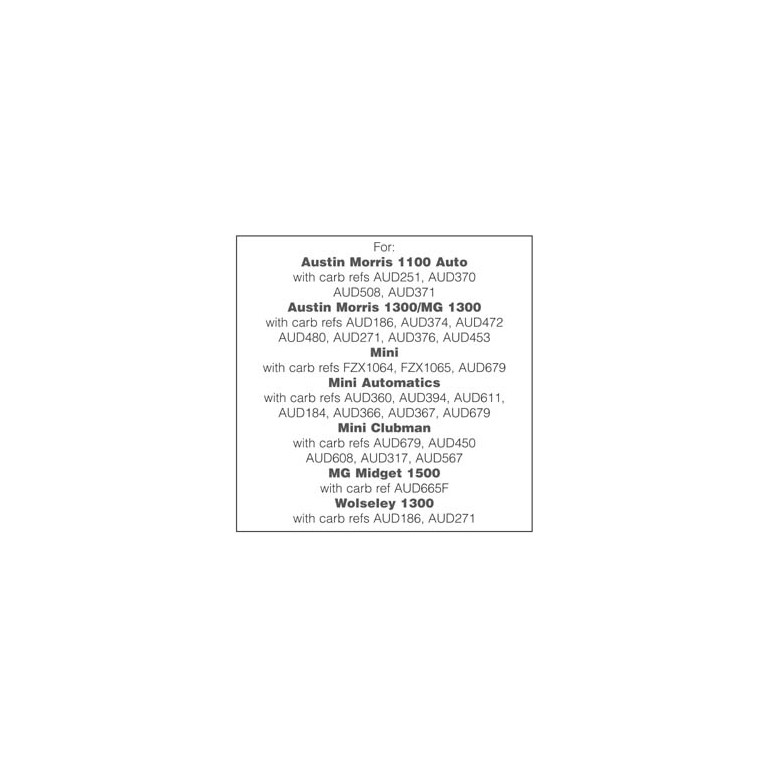 Contains new jet, float valve, all gaskets and seals, throttle disc and screws, spindle and spindle bushes to rebuild the SU carburettor on your Austin Morris 1100 Auto 1967-74, 1300 1967-72, MG 1300 1967-69, Midget 1500 1974, Mini 850/1000/1100 1975 on, Mini Automatics 848/998 1959-74, Mini Clubman 1974 or Wolseley 1300 1967-68. Please note, however, that the NEEDLE is not included and should be ordered separately