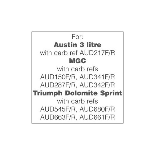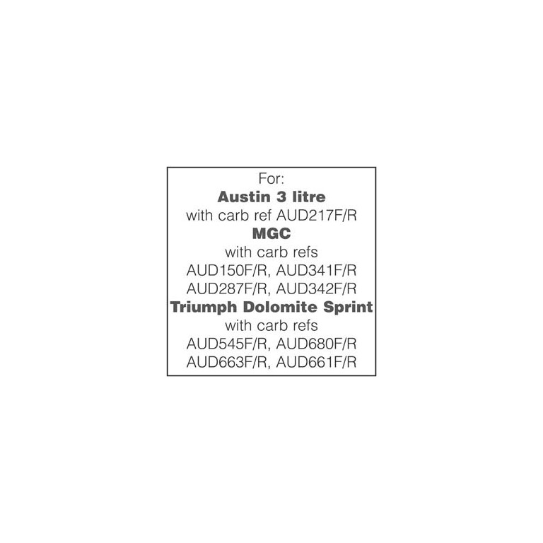 Contains new jets, float valves, all gaskets and seals, throttle discs and screws, spindles and spindle bushes to rebuild a pair of SU carburettors on your Austin 3 litre 1967-68, MGC 1967-69 or Triumph Dolomite Sprint 1973-76. Please note, however, that the NEEDLES are not included and should be ordered separately