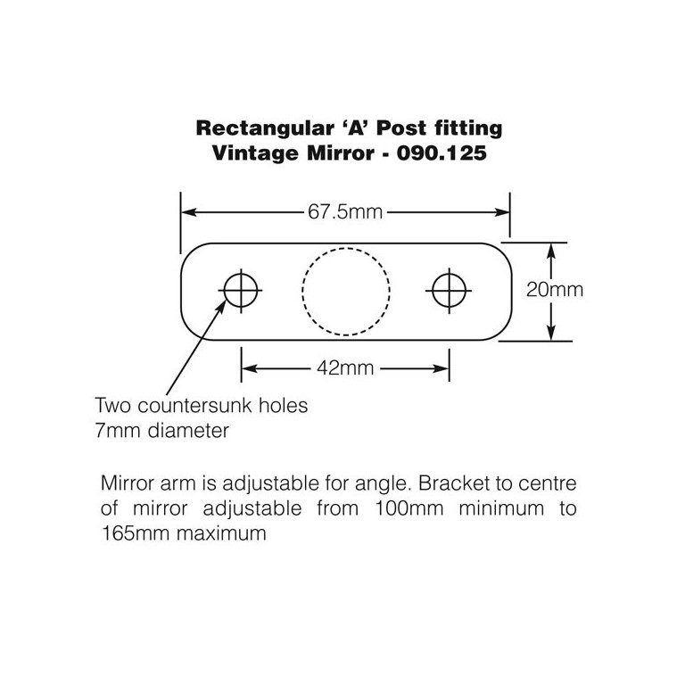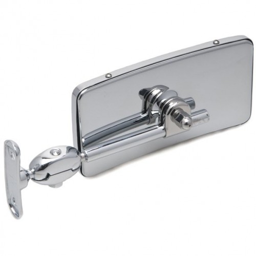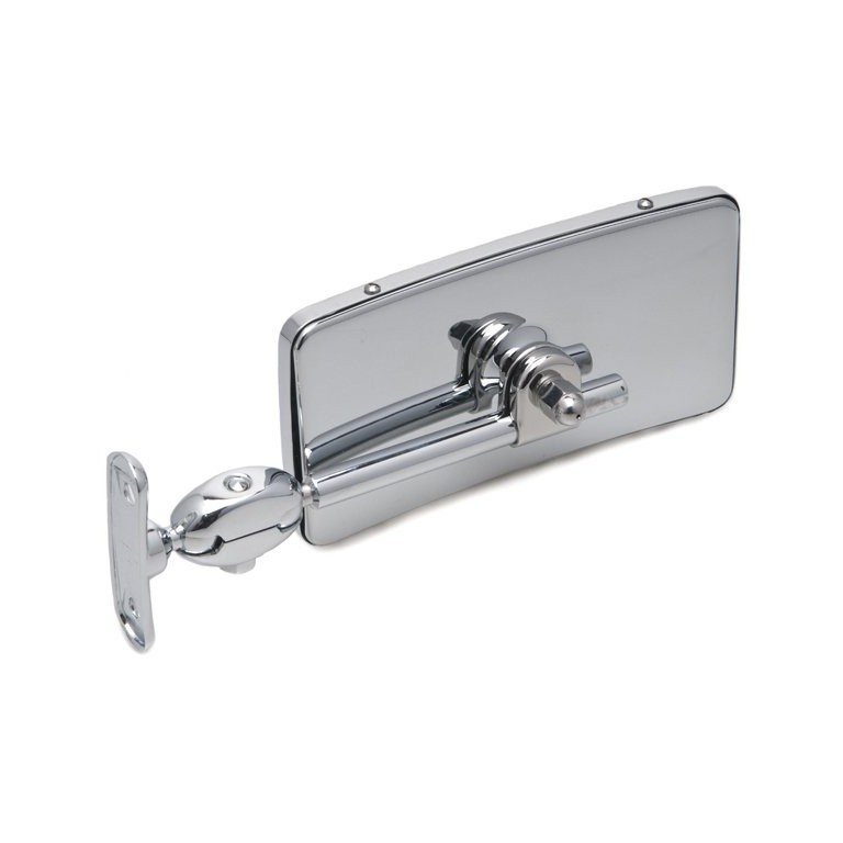 Rectangular vintage style mirror for 'A' post or windscreen pillar fitting.This convex glass mirror measures 142 x 65mm, and has a chrome plated finish. A Kit of Parts for fitting this mirror is available, as are oval style mirrors