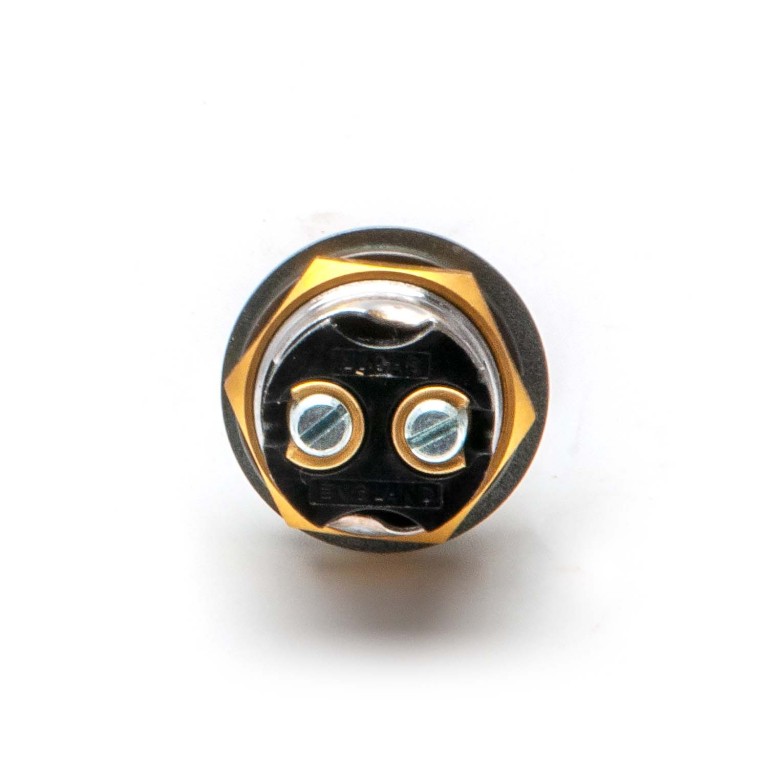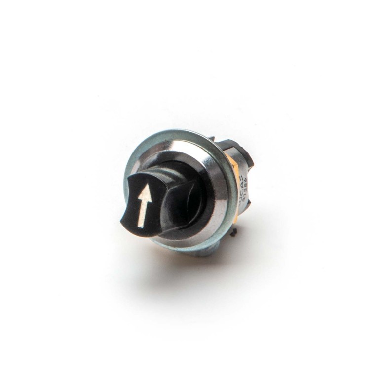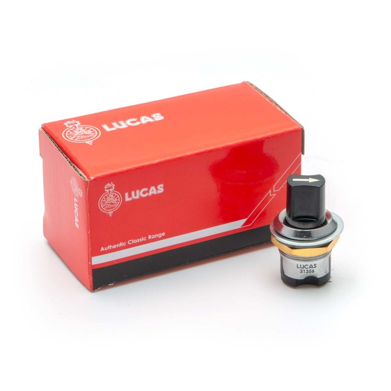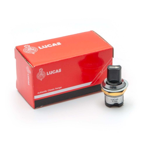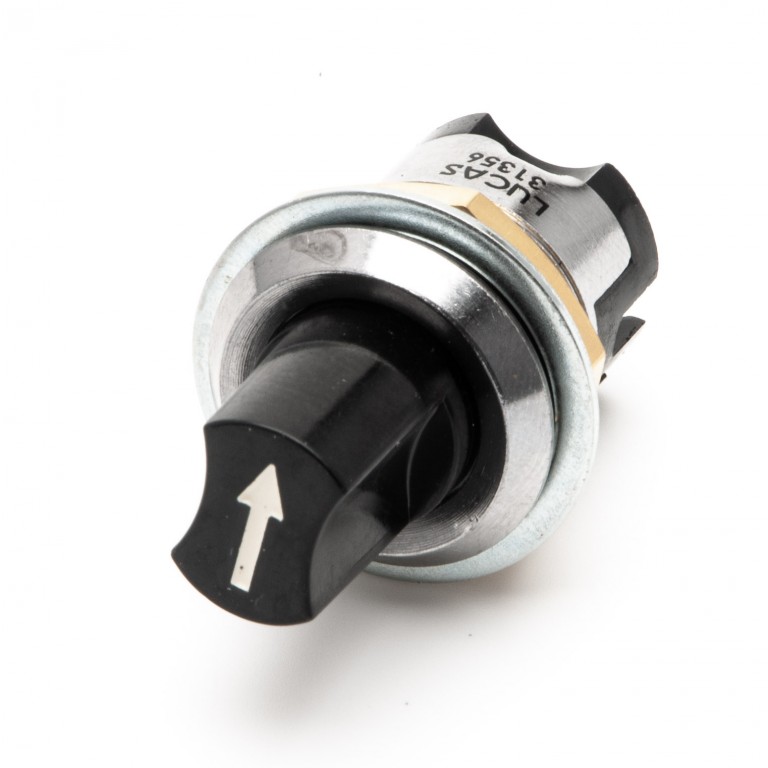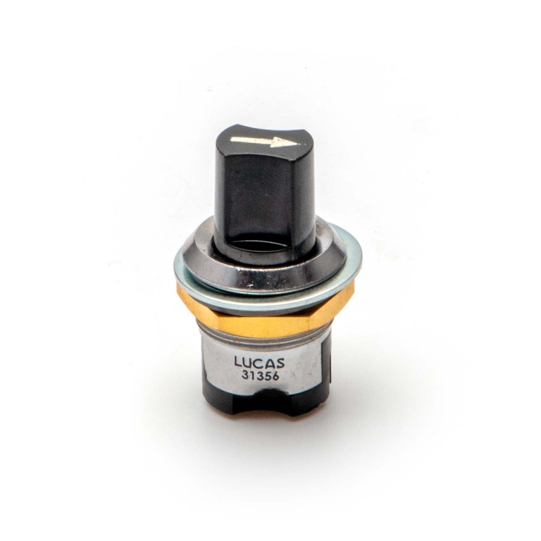 Lucas rotary on-off switch 31356 with a plain black knob with two flattened grips and chrome bezel. Requires 19mm diameter hole. The bezel is 22mm in diameter. Suitable for fitting to a metal dash.