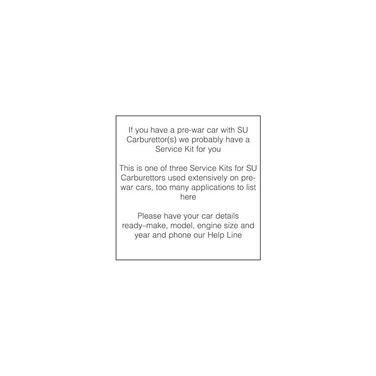 These types of SU carburettors were mainly used on pre-war cars. Take out the jet and if it bears the number AVC8183 (0.100 in) then this is the service kit you need. Contains new jet, float valve and all gaskets and seals you would need to service one carburettor. Please note, however, that the NEEDLE is not included in this Kit and must be ordered separately. (If the jet number is AVC8182 refer to CSK40 and if it is AVC8188 refer to CSK42)