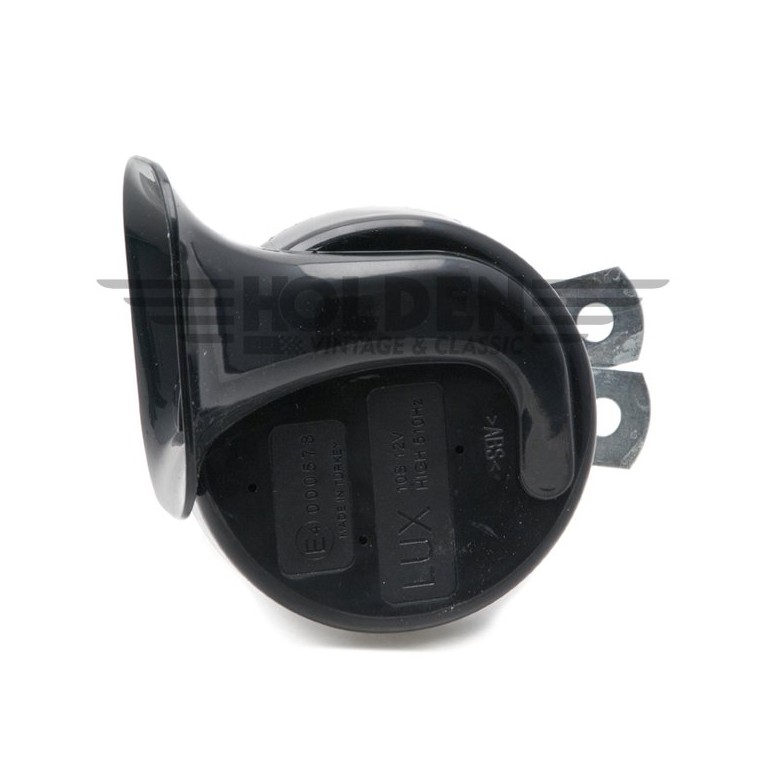 12 volt Single Terminal, black plastic Wind Tone Horn. Low tone or note. Supplied with a mounting bracket set. Electrical connection via single lucar type terminal. A low tone version is also available