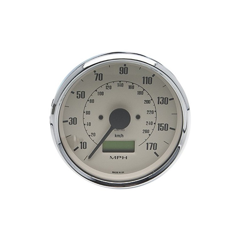 This is a technically advanced instrument with black graphics on a magnolia dial with chrome full V rim. It is designed to match the other gauges in the Smiths classic range, but it operates electronically from 12 volts (NEGATIVE EARTH ONLY) and is calibrated by you to suit the gearing on your car. It is 100mm diameter, has illumination and reads up to 170 mph. Speed sensors and screened cable are available to purchase separately.