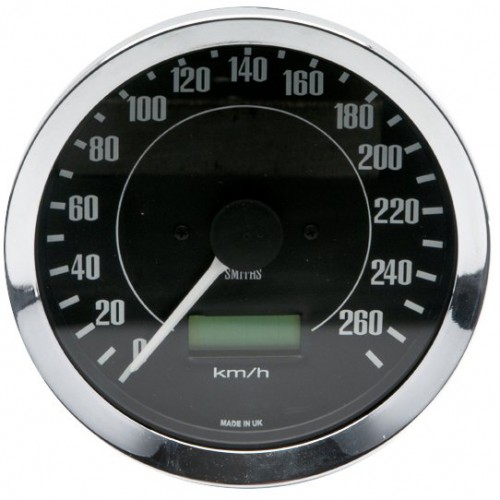 This is a technically advanced instrument with white graphics on a black dial with chrome 1/2 V rim. It is designed to match the other gauges in the Smiths classic range, but it operates electronically from 12 volts (NEGATIVE EARTH ONLY) and is calibrated by you to suit the gearing on your car. It is 100mm diameter, has illumination and reads up to 260 kph. Speed sensors and screened cable are available to purchase separately.