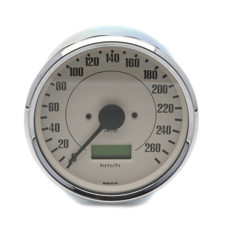 This is a technically advanced instrument with black graphics on a magnolia dial with chrome full V rim. It is designed to match the other gauges in the Smiths classic range, but it operates electronically from 12 volts (NEGATIVE EARTH ONLY) and is calibrated by you to suit the gearing on your car. It is 100mm diameter, has illumination and reads up to 260 kph. Speed sensors and screened cable are available to purchase separately.