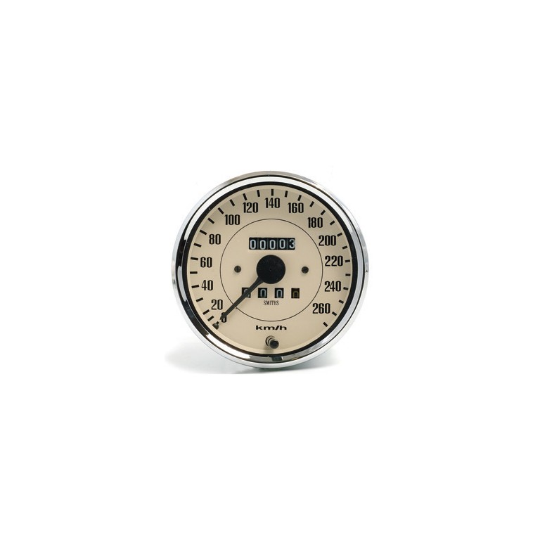 Genuine SMITHS designed instrument, skillfully crafted to the original drawings and specifications, using the original tools and dies. This one is 100 mm diameter with Full V chrome bezel, black figures on a magnolia dial reading to 260 kph and trigger cable fitting. (This is a plastic push-on type fitting. You may require a different speedo cable to complete your installation) Supplied with bulb holder and bulb, together with the necessary mounting clamps. Trip reset is via a button on the dial face.