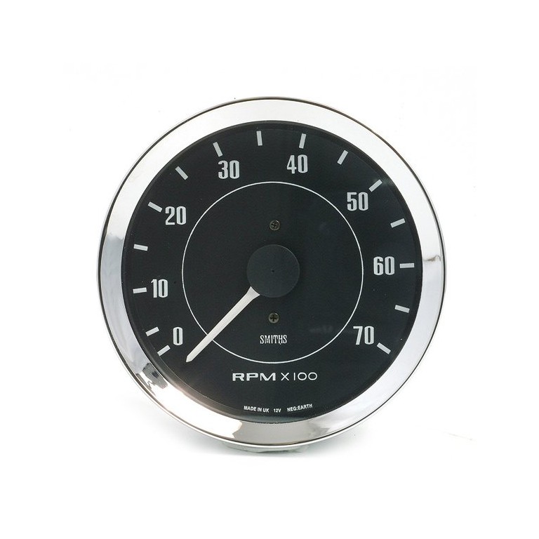 Genuine SMITHS designed instrument, skillfully crafted to the original drawings and specifications, using the original tools and dies. This one is 100mm diameter with 1/2V chrome bezel, white figures on a black dial reading from 0 to 7000 rpm and switchable for 2, 4, 6, 8 and 12 cylinder engines, including 'wasted spark' 2 cylinder engines, for example Citroen 2CV. 12 volt (NEGATIVE EARTH ONLY) electronic operation Supplied with bulb holder and bulb, together with the necessary mounting clamps. Full instructions for setup are included.