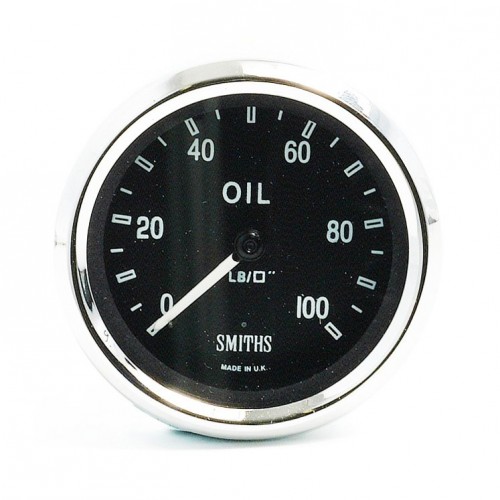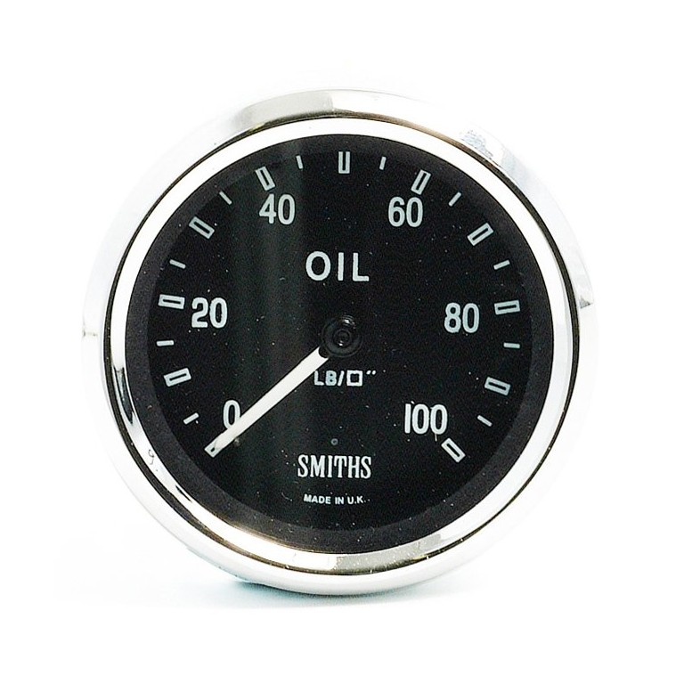 Genuine SMITHS designed instrument, skillfully crafted to the original drawings and specifications for the Cobra, using original tools and dies. 52 mm diameter with white figures on a black dial reading from 0 to 100 lbs per sq in full scale. Mechanical operation, which means you will require an oil pressure pipe, an adaptor and maybe a T piece to connect to your engine, unless you already have these in the vehicle. Supplied with bulb holder and bulb, together with the necessary mounting clamp.