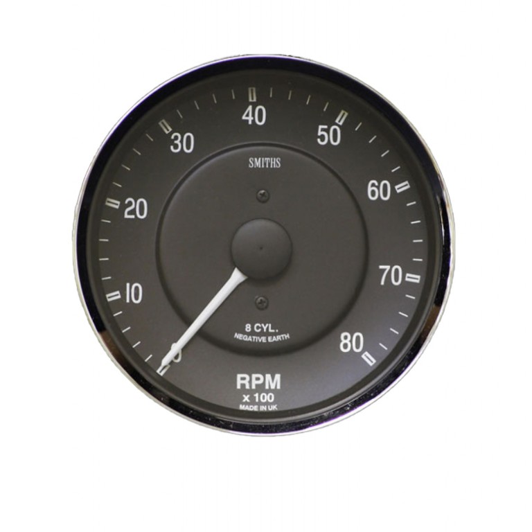 Genuine SMITHS designed instrument, skillfully crafted to the original drawings and specifications for the Cobra, using original tools and dies. 100 mm diameter with white figures on a black dial reading from 0 to 8000 rpm..12 volt (NEGATIVE EARTH ONLY) electronic operation and supplied with bulb holder and bulb, together with the necessary mounting clamps. This tacho is switchable for many different cylinder configurations via small switches under a rubber sealing grommet on the rear. Full instructions are included.