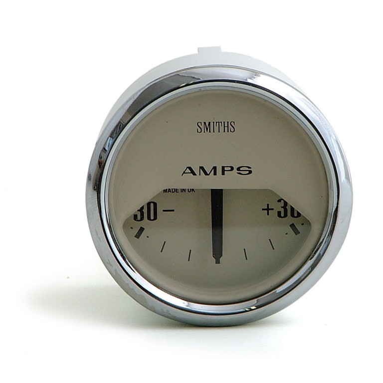 Genuine SMITHS designed instrument, skillfully crafted to the original drawings and specifications, using the original tools and dies. This one is 52 mm diameter with Full V chrome bezel, and black figures on a magnolia quadrant dial, reading from -30 to +30 amps. Supplied with bulb holder and bulb, together with the necessary mounting clamp.