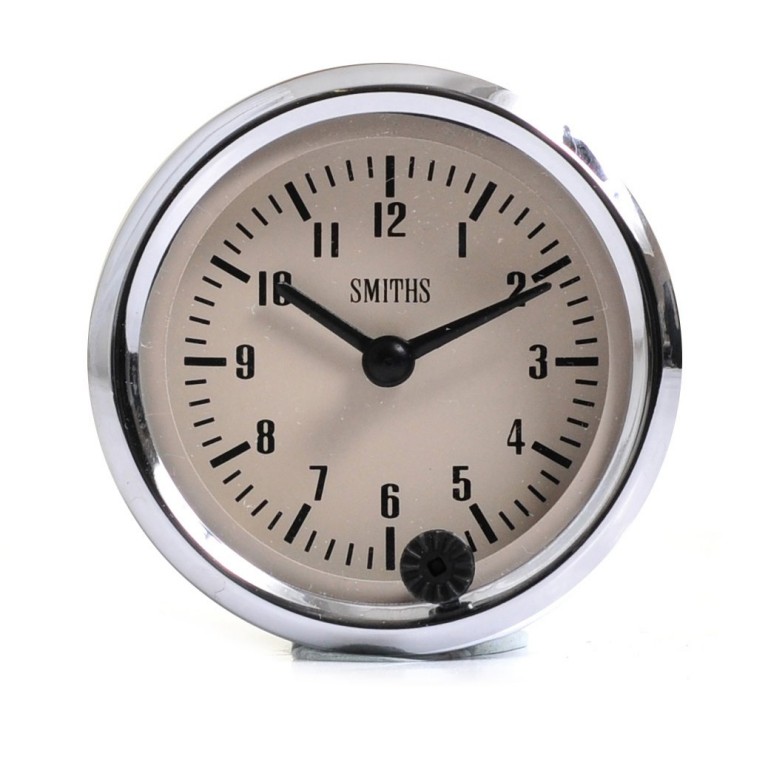 Genuine SMITHS designed instrument, skillfully crafted to the original drawings and specifications, using the original tools and dies. This one is 52mm diameter with Full V chrome bezel, black figures on a magnolia dial. Supplied with bulb holder and bulb, together with the necessary mounting clamp. Push button on dial face with power on to set. This Clock was used on Minis, but is suitable for pretty well any application.