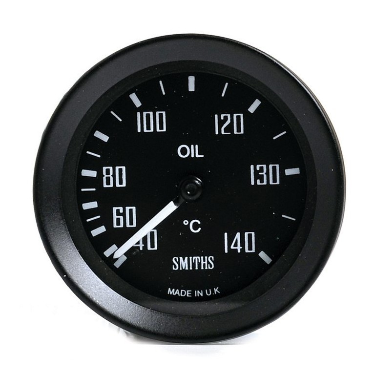 Genuine SMITHS designed instrument, skillfully crafted to the original drawings and specifications for the GT40, using original tools and dies. 52mm diameter with white figures on a black dial reading from 40 to 140 degrees C full scale. Mechanical operation, with 3048 mm (120 in) long capillary with 5/8 UNF male thread adaptor to screw into the block. Other adaptors are available if required. Supplied with bulb, bulb holder and mounting clamp.