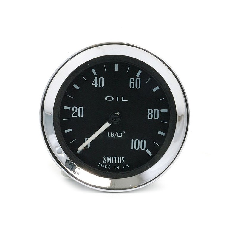 Genuine SMITHS designed instrument, skillfully crafted to the original drawings and specifications, using the original tools and dies. This one is 52 mm diameter with 1/2V chrome bezel, white figures on a black full scale dial reading from 0 to 100 lbs per square inch. Supplied with bulb holder and bulb, together with the necessary mounting clamp. You will require an oil pressure pipe, an adaptor and maybe a T piece to connect to your engine, unless you already have these in the vehicle.