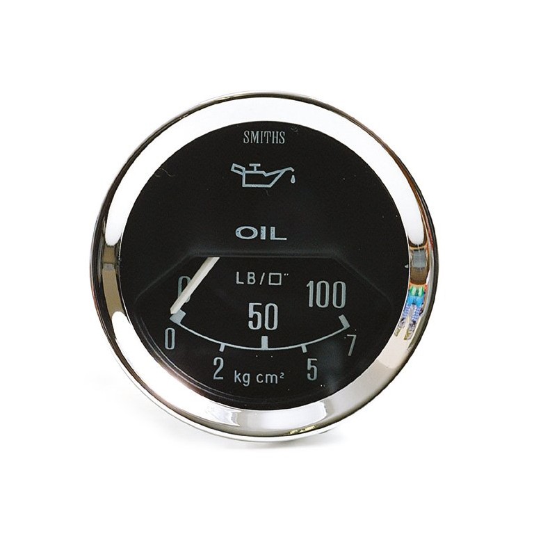 Genuine SMITHS designed instrument, skillfully crafted to the original drawings and specifications, using the original tools and dies. This one is 52 mm diameter with 1/2V chrome bezel, white figures on a black quadrant dial reading from 0 to 100 lbs per square inch. Supplied with bulb holder and bulb, together with the necessary mounting clamp. An oil pressure pipe, together with the relevant adaptors is available separately, as is a range of T pieces to suit most applications. The pipe connection thread is 1/8x28 BSP.
